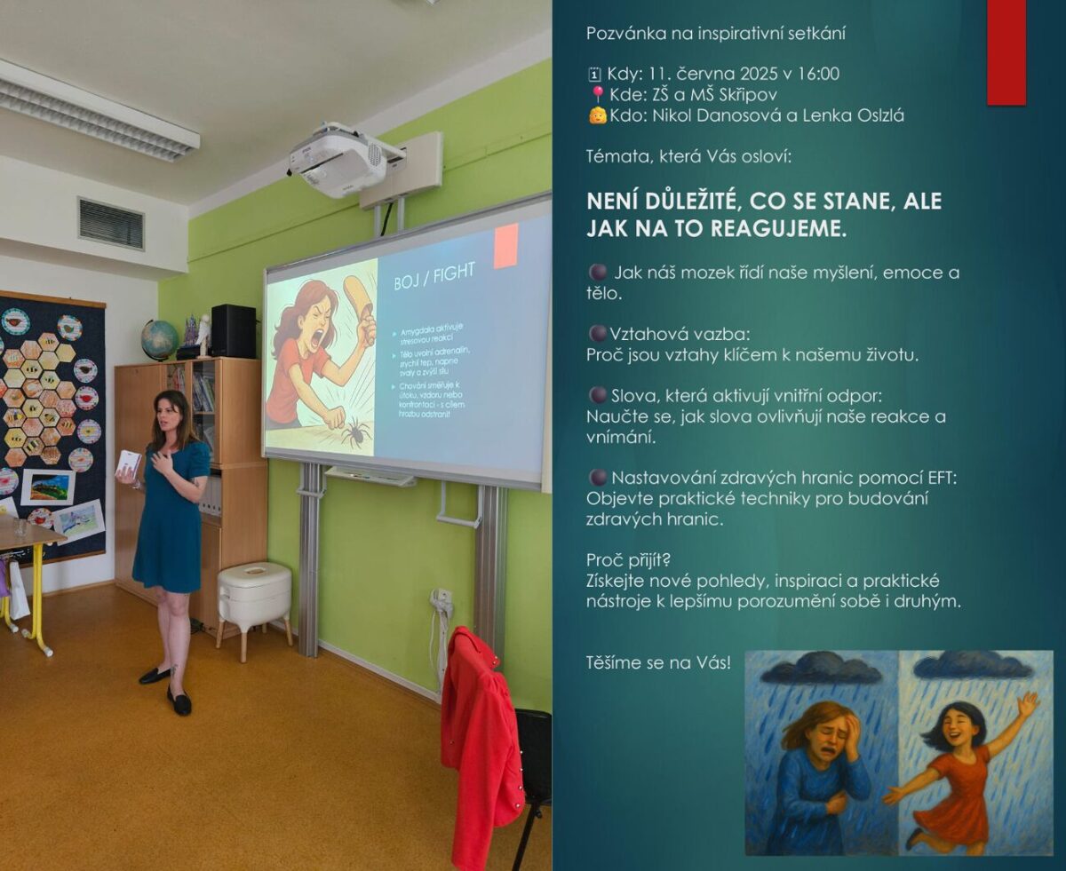 Společně jsme se podívaly na to, jak náš mozek ovlivňuje myšlení, emoce i tělo, proč jsou vztahy klíčem k našemu životu, jak fungují slova, která v nás vyvolávají odpor, a jak si nastavovat zdravé hranice pomocí EFT.